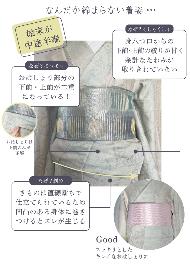 おはしょりがくしゃくしゃ、モコモコ、斜めになってしまう原因