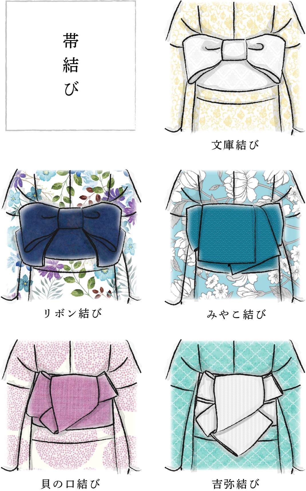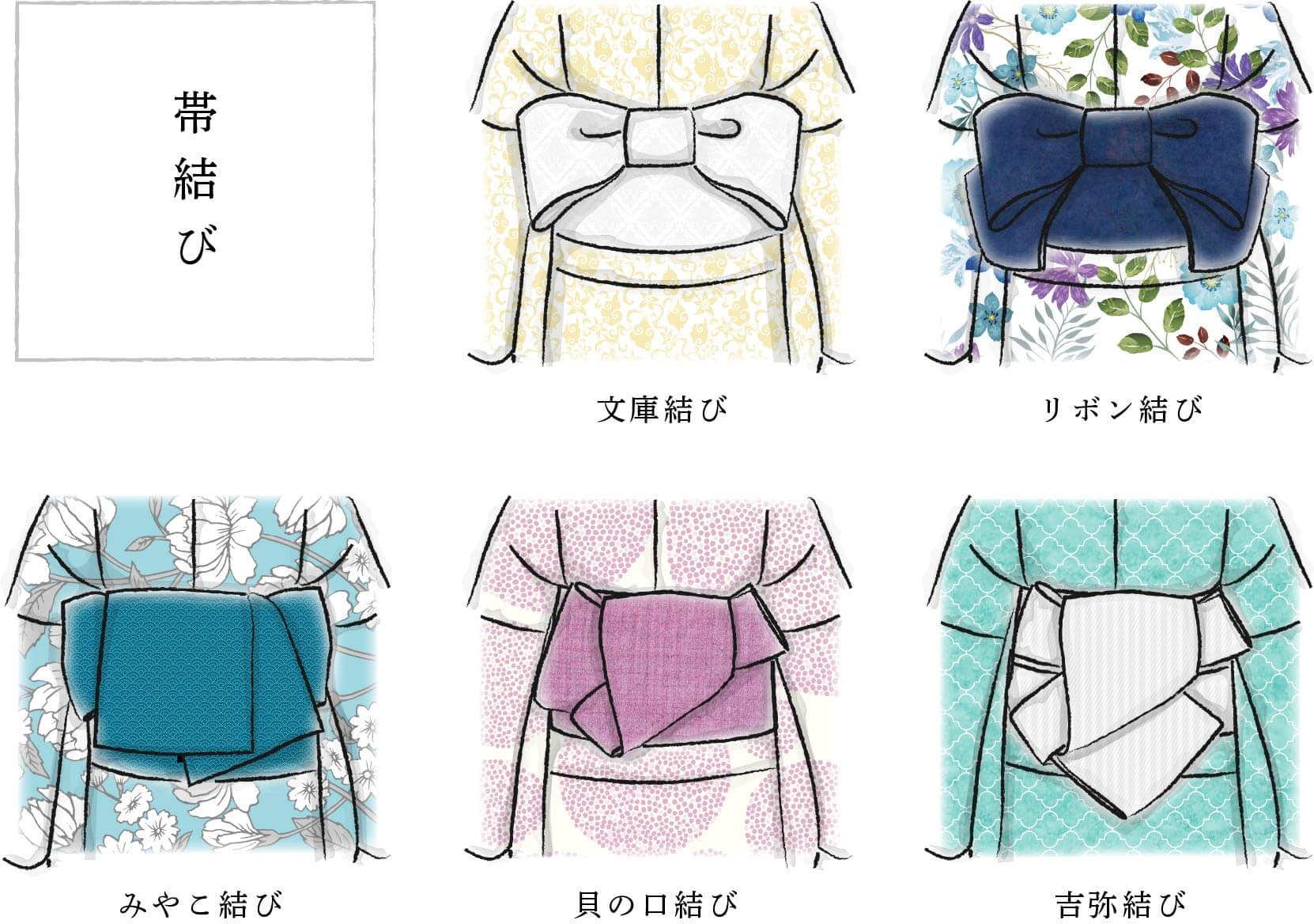 まずは基本の「文庫結び」とそれをアレンジした「リボン結び」。若々しく可愛らしい帯結びです。オトナかわいい着こなしには、ボリュームもあり優雅な雰囲気の「みやこ結び」がおすすめ。粋なカッコ良さを目指すなら「貝の口」や「吉弥結び」を。