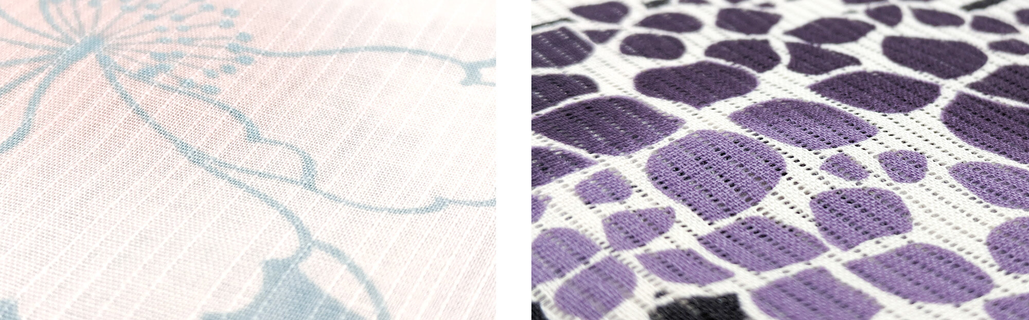 定番の「綿コーマ」は肌触りのよい平織りの生地。透け感があり涼しげな「綿絽」。シボのある素朴な風合いの「綿紬」。綿糸を撚りさらりとした質感の「綿縮」。シャリ感のある「麻」。綿と麻の特徴を兼ね備えた交織の「綿麻」。また透け感がありさらっとした手触りの「綿紅梅」や薄い絹地に綿糸を織り込んだ「絹紅梅」などの高級品もあります。