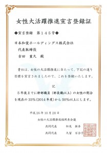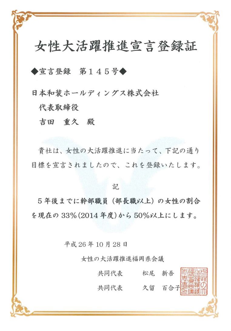 News お知らせ 「女性大活躍推進宣言」を登録しました 2014.10.31 このたび、「女性の大活躍推進福岡県議会」の取り組みに賛同し、女性の大活躍を実現させるための目標を定める「女性大活躍推進自主宣言」を登録しました。 当社では着付け講師はもちろん、社員でも多くの女性が活躍しています。現在でも、幹部社員(部長職以上)の33%を女性が占めていますが、5年後までに50%以上にすることを目標に定めました。 これからも、きものを通じて、全ての女性が生き生きと活躍する企業を目指します。 お知らせトップ・年アーカイブ chevron_right お知らせトップ chevron_right 2026年chevron_right 2025年chevron_right 2024年chevron_right 2023年chevron_right 2022年chevron_right 2021年chevron_right 2020年chevron_right 2019年chevron_right 2018年chevron_right 2017年chevron_right 2016年 chevron_left 次のニュース 前のニュース chevron_right