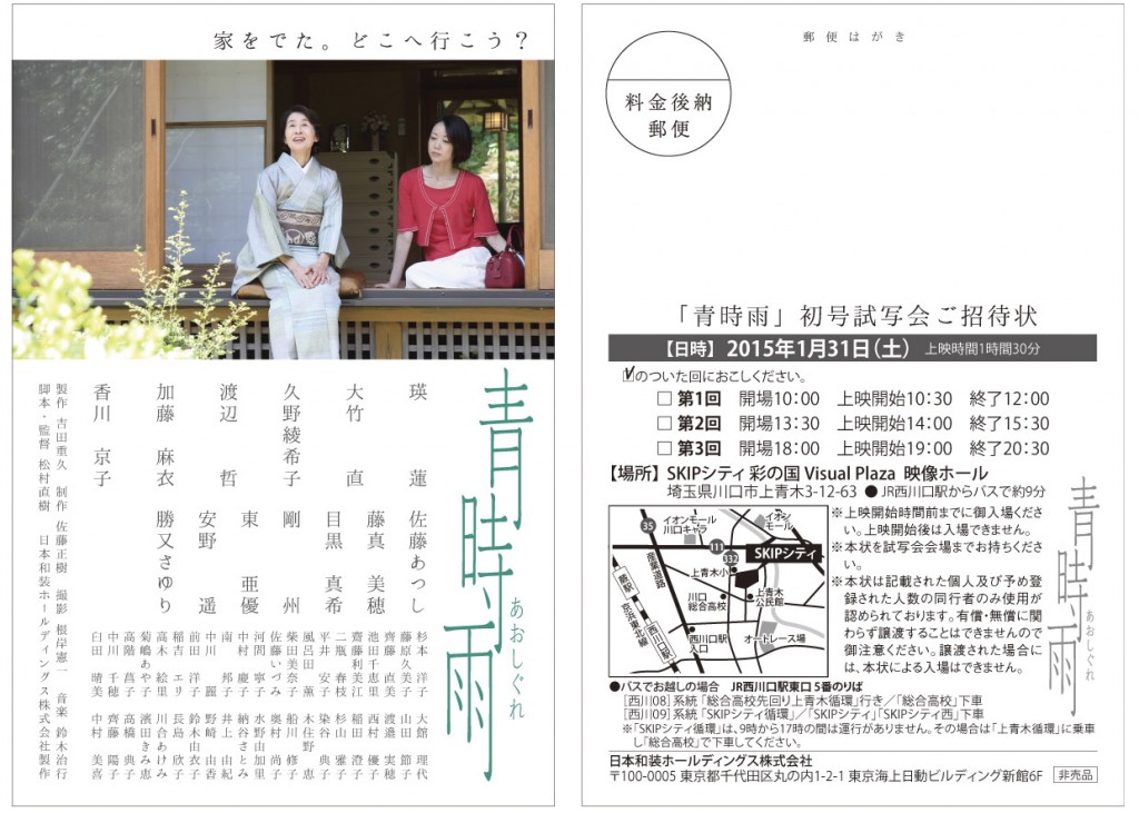 昨年の夏、香川京子さん、渡辺哲さんら有名俳優の出演を得て撮影した日本和装製作の映画「青時雨」。初号試写会がいよいよ今週末、1/31(土)に行われます。