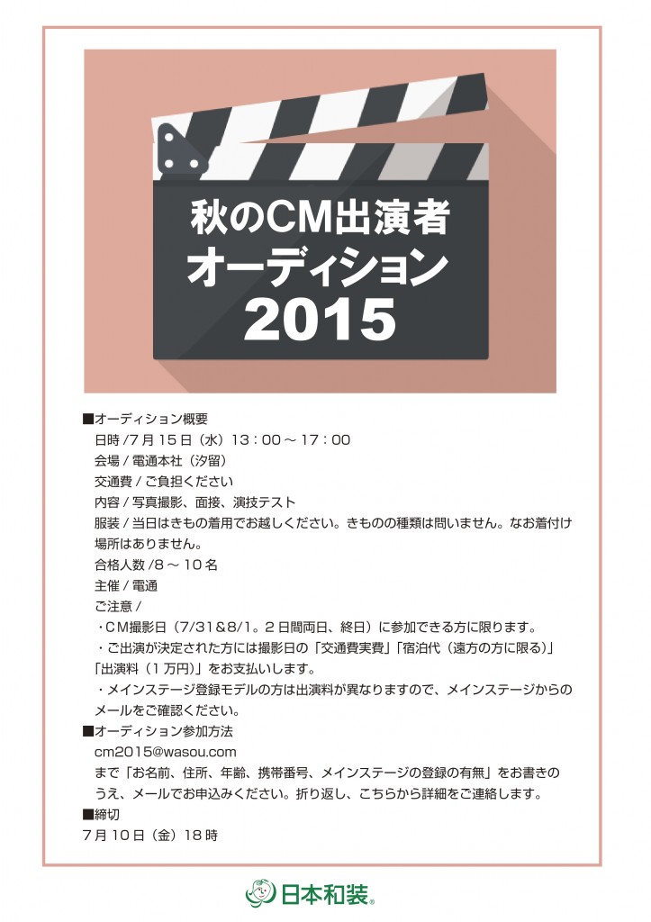 cm2015@wasou.com まで「お名前、住所、年齢、携帯番号、メインステージの登録の有無」をお書きのうえ、メールでお申込みください。 折り返し、こちらから詳細をご連絡します。