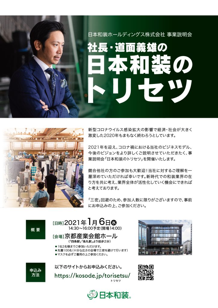 2021年を迎え、コロナ禍における当社のビジネスモデル、今後のビジョンをより詳しくご説明させていただきたく、事業説明会「日本和装のトリセツ」を開催いたします。競合他社の方のご参加も大歓迎!当社に対するご理解を一層深めていただければ幸いです。新時代での和装業界の在り方を共に考え、業界全体が活性化していく機会にできればと考えております。