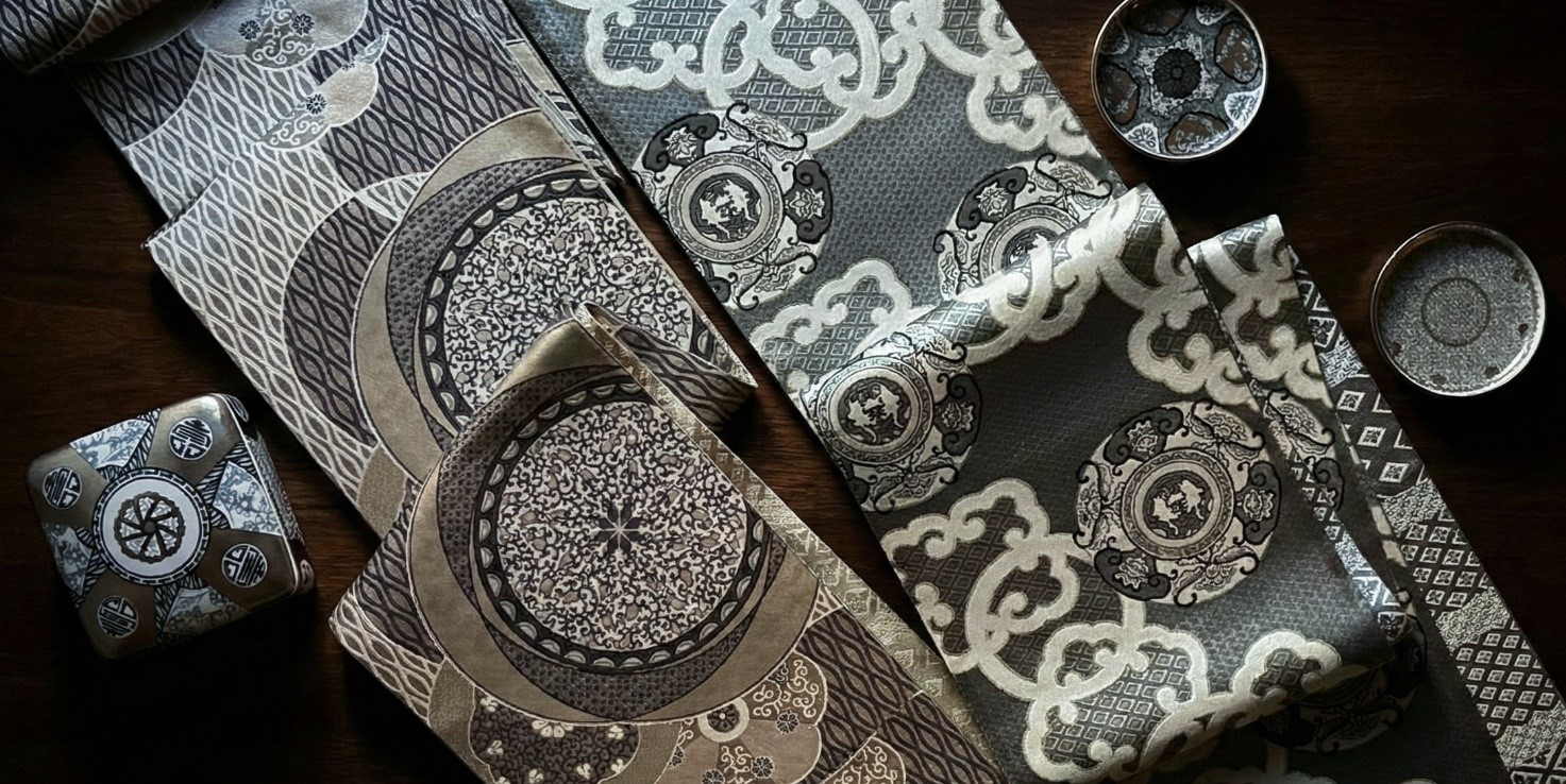 本企画は、2025年に創業220年を迎えるアリタポーセリンラボと、設立70年を迎えるはかた匠工芸が、互いの節目を祝う記念事業として実現。有田焼の洗練された意匠を、博多織・佐賀錦の伝統技法で表現した、至高のシリーズです。帯の制作にあたっては、松本社長自らが意匠を監修。磁器の持つ艶や色気を、織物の立体感で表現することに挑みました。
